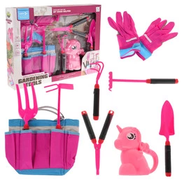 Różowy zestaw Małego Ogrodnika 9 el. dla dzieci 3+ Konewka-Jednorożec + Torba + Rękawice + Grabki + Nożyce + Widełki