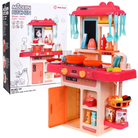 | | Kuchnia posiada zlew z kranem z którego wypływa woda, dwa palniki indukcyjne, ruchome pokrętła, otwieraną lodówkę, półeczki, znikopis oraz mnóstwo akcesoriów kuchennych. Po przekręceniu palników na kuchence słychać odgłosy gotowania i towarzyszy im mruganie czerwonego światełka. Dodatkowo jeden palnik posiada funkcję tworzenia pary wodnej. Ciekawym rozwiązaniem jest umieszczenie znikopisu nad palnikiem. Można na nim notować listę zakupów lub przepisy. Cały zestaw składa się z 42 elementów. Znakomite wykonanie, żywe kolory, kolorowe opakowanie. Zabawka zasilana bateriami 3 x AA (brak w zestawie). Zabawka dla dzieci powyżej 3 roku życia, posiada certyfikat CE. |