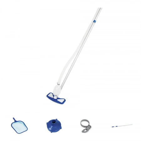| - kij teleskopowy o max. długości 2,79 m, - różne końcówki służące do podpięcia pompy filtrującej, - odkurzacz z zbiornikiem wielokrotnego użytku do zbierania basenowych śmieci, - siatka do wyławiania zanieczyszczeń basenu, - wąż ogrodowy o długości 7,5 m, szerokości 3,2 m. |