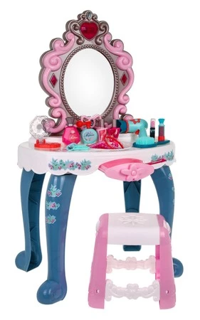 | | Interaktywna toaletka z lustrem, taboretem i akcesoriami dla małej księżniczki od trzeciego roku życia. Zabawka posiada funkcję dźwięku (trzy melodie) i światła (serduszko nad lustrem i dwa diamenciki po bokach lustra). Zabawka zasilana bateriami typu 2 x AA 1,5V (brak w zestawie). Wszystkie kosmetyki dołączone do zestawu są atrapami. |