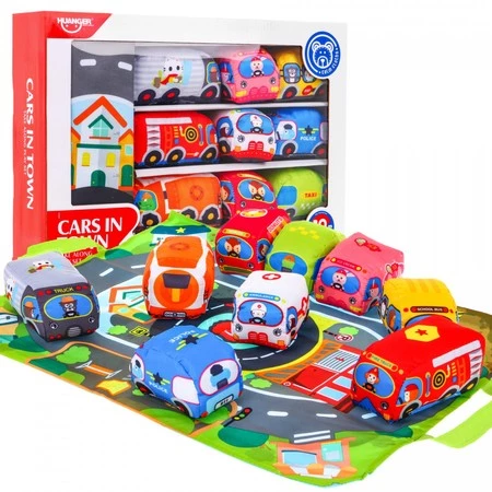 | | - 9 bezpiecznych, miękkich w dotyku autek: * samochód ciężarowy, *pojazd z lodami, * autobus szkolny, * wóz strażacki, * ambulans, * taksówka, * betoniarka, *pojazd z donutami, *auto policyjne, - mata z ulicami i budynkami |
