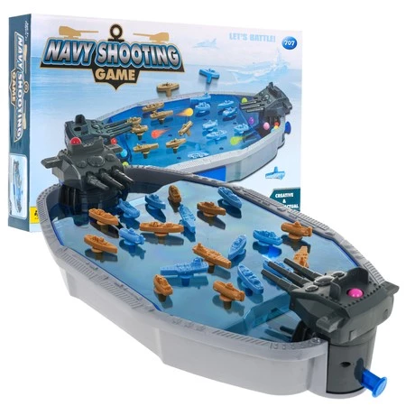 - okręt ok. 40 cm, - piłeczki – pociski o średnicy ok. 1 cm, - statki różnej wielkości, mniejsze ok. 3 cm długości, większe ok. 4,5 cm długości, - opakowanie ok. 41,8 cm x 25,7 cm x 6,5 cm. |