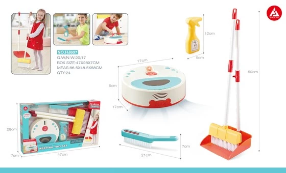 - robot sprzątający ok. 17 cm x 6 cm x 17 cm, - szufelka ze stojakiem ok. 58 cm x 17,5 cm x 15 cm, - miotła ok. 64 cm x 15,5 cm x 3,5 cm, - zmiotka ok. 21 cm x 5 cm x 2,5 cm, - atrapa środka czyszczącego ok. 12,5 cm x 5 cm x 2,5 cm, - opakowanie ok. 47 cm x 28 cm x 7 cm. |
