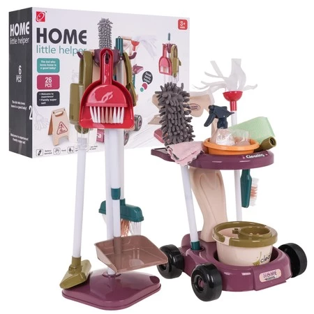 Duży, bogato wyposażony zestaw sprzątający z wózkiem, stojakiem, odkurzaczem pionowym i akcesoriami to propozycja dla dzieci od 3-go roku życia. Zestaw zawiera aż 26 elementy. Wózek posiada kółeczka, wygodną rączkę do pchania oraz dwie półeczki do przechowywania akcesoriów. Odkurzacz pionowy wyposażono w dwie wymienne ssawki takie jak szczotkę i ssawkę szczelinową. Zasilany jest bateriami typu 3 x AA 1,5V, baterii brak w zestawie. Po włączeniu wydaje odgłosy odkurzania i wciąga drobne kuleczki styropianowe. Niektóre akcesoria takie jak zmiotka z kijem i szczotka są regulowane. Pojemniczek ze spryskiwaczem można uzupełniać wodą.