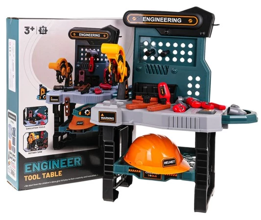 Bogato wyposażony warsztat z kaskiem, pilarką tarczową i akcesoriami to propozycja dla dzieci od 3-go roku życia. Zestaw składa się z 37 elementów do złudzenia przypominających realne narzędzia. Poszczególne narzędzia można dowolnie rozmieścić na praktycznym stole warsztatowym. Funkcje zestawu: - odpowiedni dla dzieci od 3-go roku życia, - wykonany z najlepszej jakości plastiku w żywych kolorach, - bogato wyposażony, - pilarka tarczowa obsługiwana manualnie. |