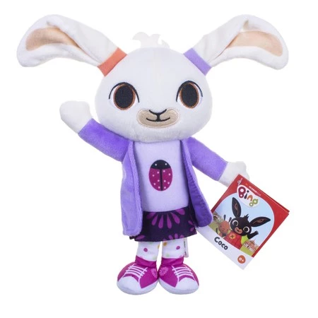 Te słodkie i urocze pluszowe maskotki wzorowane na bohaterach kultowego serialu dla dzieci zostały wykonane z supermiękkich materiałów, dlatego doskonale nadają się do przytulania! Bing jest ubrany w swoje słynne ogrodniczki w kratkę, zupełnie jak w serialu. Sula ma na sobie piękną, różową sukienkę, a Coco fioletowy sweterek i śliczne, różowe tenisówki.