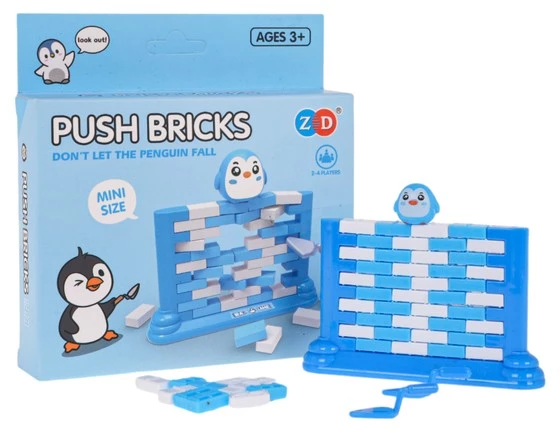 Gra zręcznościowa Ściana dla dzieci od 3-go roku życia. Gra polega na zbudowaniu ściany z klocków na specjalnie do tego przeznaczonej podstawce, a następnie wypychaniu z muru poszczególnych cegiełek, specjalnie do tego przeznaczoną kielnią. Na górze muru znajduje się figurka pingwina, musimy uważać, by nie spadła. Wygrywa ten, który wypychając cegły, nie spowoduje zawalenia się muru i upadku pingwina. W grę możemy grać samodzielnie, lub w więcej osób. Gra uczy koncentracji, logicznego myślenia, poprawia koordynację ręka-oko. Funkcje gry: - przeznaczona dla dzieci od 3-go roku życia jak i dorosłych, - znakomicie wykonana, - doskonały trening umiejętności i cierpliwości, - ćwiczy koncentrację i logiczne myślenie, - pomaga się zrelaksować, - świetny sposób na wspólne spędzenie czasu, - idealny sposób na nudę lub oderwanie dzieci od komputerów, telefonów, tabletów. |