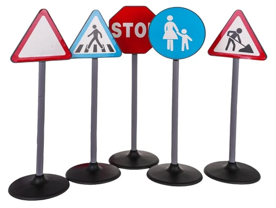 - 5 znaków: • znak stop, • znak przejście dla pieszych, • znak roboty drogowe, • znak droga dla pieszych, • trójkąt ostrzegawczy, - naklejki ze znakami. |