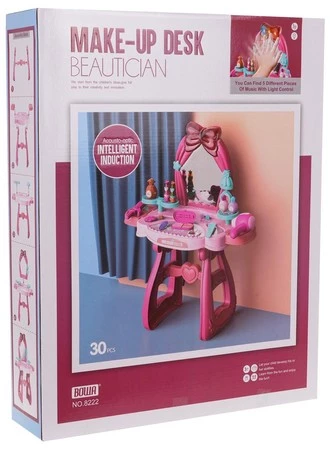 Bogato wyposażona toaletka z mnóstwem akcesoriów z funkcją światła i dźwięku dla dzieci od 3-go roku życia. Toaletka wykonana została z najlepszej jakości plastiku w bogatych kolorach. Zasilana jest bateriami typu 3 x AA 1,5 V (baterii brak w zestawie). Kokardka znajdująca się nad lustrem posiada czujnik, który pod wpływem ruchu uruchamia efekty świetlne w postaci mrugających światełek oraz efekty dźwiękowe w postaci wesołych melodii. Funkcje zestawu: - odpowiedni dla dzieci od 3-go roku życia, - wykonany z najlepszej jakości plastiku w żywych kolorach, - lustro z efektami dźwiękowymi i świetlnymi, - bogactwo akcesoriów do malowania, - stabilna konstrukcja. |