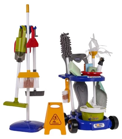- wózek do sprzątania na kółkach, - tabliczka „uwaga śliska podłoga”, - wiaderko, - mop, - szczotka do kurzu, - zmiotka i szufelka, - skrobaczka, - ściereczka, - gąbka ostra, - spryskiwacz, - mydło, - odkurzacz pionowy, - duża szufelka, - duża zmiotka, - wieszak na przedmioty, - miska, - 3 x kartoniki ze środkami czyszczącymi, - końcówka szczelinowa do odkurzacza, - saszetka z kulkami styropianowymi, - naklejki dekoracyjne. |