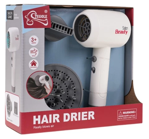 Interaktywna suszarka do włosów z nawiewem i odgłosami dla dzieci od 3-go roku życia. Suszarka wygląda jak prawdziwa, została znakomicie dopracowana z dbałością o szczegóły. Po włączeniu jej wydaje charakterystyczne odgłosy suszenia i emituje strumień powietrza, który dodatkowo można regulować. W zestawie znajdują się wymienne dysze do suszenia takie jak dyfuzor oraz nasadka skupiająca. Zabawka zasilana jest bateriami typu 1 X AA 1,5 V (brak w zestawie).