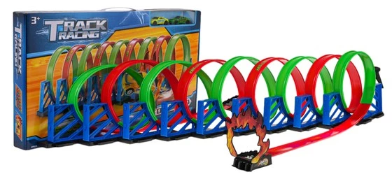 Tor wyścigowy z wyrzutnią i 9 pętlami 360 stopni, dla dzieci od 3-go roku życia. Tor wykonano z najlepszej jakości plastiku w żywych kolorach. Tor posiada odcinek prosty do rozpędzenia pojazdu, 9 pętli 360 stopni, wyrzutnię i dwa pojazdy. Pojazdy napędzane są napędem pull back. Wystarczy delikatnie nacisnąć pojazd do tyłu, by przejechał tor z pełną mocą.