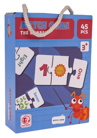 - 45 puzzli – 15 cyfr arabskich, 15 puzzli z rysunkiem różnej ilości rzeczy, 15 puzzli z nazwą cyfry w języku angielskim. |