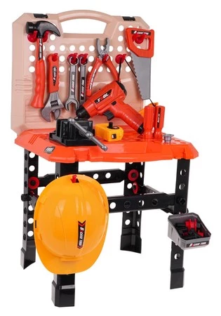 - części konstrukcyjne warsztatu i walizki, - kask, - wiertarko-wkrętarka, - imadło, - kombinerki, - klucz oczkowy, - klucz płasko-oczkowy, - klucz francuski, - klucz nasadowy, - młotek, - okulary ochronne, - śrubokręt płaski i krzyżakowy, - piła ręczna, - miarka, - 20 x nasadki, - 16 x śruba mniejsza, - 4 x śruba większa, - kołki, - 10 haczyki, - atrapy drewienek do wkręcania, - elementy do wkręcania, - naklejki dekoracyjne. |