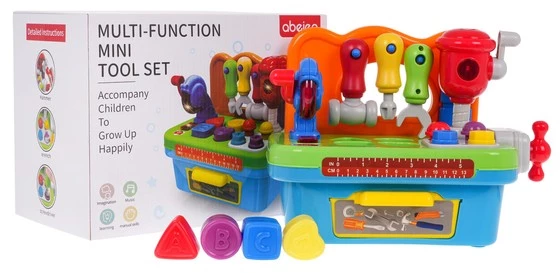 Multifunkcyjny, interaktywny warsztat dla maluszka od trzeciego roku życia, z efektami dźwięku i światła. Zabawka wykonana została z najlepszej jakości plastiku w żywych kolorach i jest całkowicie bezpieczna dla maluszka. Każdy element zestawu, został specjalnie przystosowany do rączek maluszka, a praktyczne uchwyty, umożliwiają łatwe uruchamianie. Na blacie warsztatu znajduje się piła tarczowa z efektami dźwięku charakterystycznego dla tego urządzenia i efektami światła, sorter kształtów i kolorów. Po boku warsztatu jest pokrętło, które podczas ruchu wydaje odgłosy. Nad blatem mamy półkę do zawieszenia narzędzi takich jak śrubokręt, klucz francuski i młotek. Tutaj znajduje się również ruchomy młot udarowy z efektem dźwięku i światła. Pod blatem warsztatu jest otwierana szufladka na klocuszki i narzędzia. Zabawka stymuluje zmysły maluszka i zachęca do aktywnej zabawy. Idealnie rozwija zdolności motoryczne i myślenia. Zabawka zasilana jest bateriami typu 3 x AG13 (baterie znajdują się w zestawie).