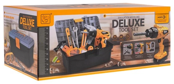 Bogato wyposażony zestaw narzędzi z interaktywną wiertarko-wkrętarką oraz skrzynką narzędziową dla dzieci powyżej 3-go roku życia. Zestaw wykonany został z najlepszej jakości plastiku i posiada aż 37 elementów. Prócz dużej skrzynki na narzędzia, wyglądającej profesjonalnie w zestawie mamy też: interaktywną wiertarko-wkrętarkę z wymiennymi bitami, okulary ochronne, maseczkę, śrubokręt, młotek, klucz francuski, kombinerki, obcęgi, oraz wiele śrubek, nakładek, drewienek do wkręcania. Wiertarko-wkrętarka zasilana jest bateriami typu 2 x AA 1,5 V (brak w zestawie). Wkręca i wykręca, posiada wymienne bity, oraz wyjmowany akumulator.