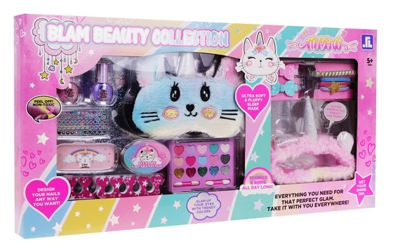 - opaska na włosy z motywem jednorożca, - opaska na oczy z motywem jednorożca, - 2 separatory do paznokci - 2 lakiery do paznokci, - paleta 15 cieni, - 2 pędzelki dwustronne do cieni, - 4 x gumki do włosów, - sprężynka do włosów, - 2 x spinki do włosów, - pilniczek do paznokci, - naklejki na paznokcie |