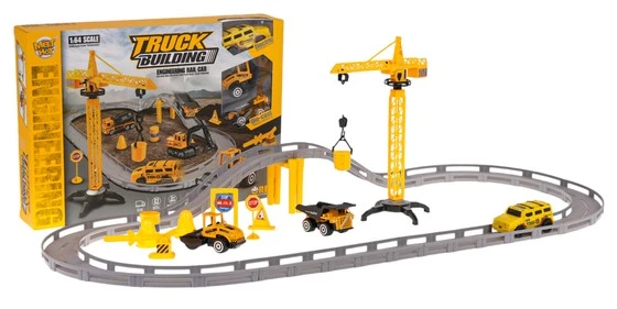 Bogato wyposażony zestaw tor z autkami budowlanymi i dźwigiem dla dzieci od 3-go roku życia. Zestaw składa się z 21 elementów do samodzielnego złożenia. Wykonany został z najlepszej jakości plastiku. Tory posiadają barierki zabezpieczające autka przed wypadaniem. Dźwig wyposażono w ruchome elementy takie jak obrotowe ramię o 360 stopni i opuszczany hak z załadunkiem (manualnie na korbkę). W zestawie znajdują się 3 autka budowlane takie jak: wywrotka, walec i autko elektryczne. Koparka i walec posiadają metalową karoserię oraz ruchome elementy. Walec posiada ruchomy i obrotowy bęben, a wywrotka podnoszoną i opuszczaną przyczepę. Autko elektryczne zasilane jest bateriami typu 1 x AA 1,5 V (brak w zestawie). Funkcje zestawu: - przeznaczony dla dzieci od 3-go roku życia, - wykonany z najlepszej jakości materiałów, - zestaw składa się z 21 elementów do samodzielnego montażu, - ruchome elementy zestawu: dźwig z obrotowym ramieniem i ruchomym hakiem, podnoszona przyczepa wywrotki, ruchomy bęben walca, szlaban, - 2 pojazdy posiadają metalową karoserię, - autko elektryczne jeździ automatycznie, - autka wykonane w skali 1:64. |