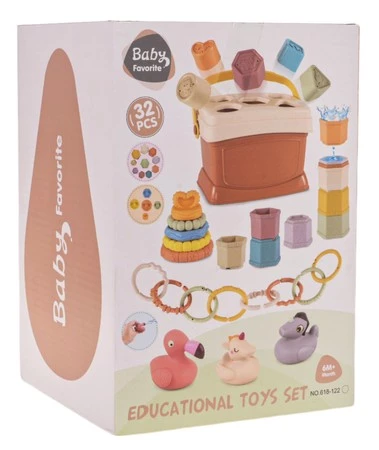 Zestaw kolorowych zabawek edukacyjnych dla maluszków od 6-go miesiąca życia. W skład zestawu wchodzi sorter kształtów z wygodną rączką do przenoszenia, klocuszki, gumowe zwierzaki, piramidki do układania wieży, okręgi konstrukcyjne i elementy do wpinania. Różnorodne kolory i kształty przyciągają wzrok maluszka i zachęcają do zabawy. Funkcje zestawu: - uczy kolorów i kształtów, - uczy budować konstrukcję, układać elementy na sobie, - pobudza zmysły maluszka kolorami i różnorodnością elementów, - daje wiele możliwości zabawy, - uczy utrzymania porządku, wszystkie elementy zestawu można schować po skończonej zabawie do boxu, - idealna zabawka do domu, do kąpieli czy do piasku. |