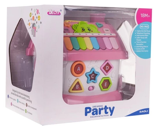 Interaktywny, edukacyjny domek dla dzieci od 18-go miesiąca życia. Domek wykonany został z najlepszej jakości plastiku, w żywych kolorach, przyciągających wzrok dziecka i zachęcających do edukacyjnej zabawy. Domek posiada 4 ściany oferujące różne atrakcje, różowy daszek oraz rączkę do przenoszenia. Zabawka zasilana jest bateriami typu 3 x AA 1,5 V (brak w zestawie). Do zestawu dołączone jest również różowe autko. Ścianka z drzwiami garażowymi i zegarem. Na tej ścianie znajduje się zegar z ruchomymi wskazówkami i otwieranymi drzwiami do garażu. Po otwarciu garażu wyjeżdża ze środka różowy samochodzik (dołączony do zestawu). Ścianka z alfabetem Na tej ściance znajduje się włącznik i wyłącznik z regulacją głośności. W różnokolorowych figurach geometrycznych umieszczono litery: A, B, C, D, E. Po naciśnięciu raz na literkę usłyszymy jej nazwę w języku angielskim. Po ponownym naciśnięciu usłyszymy nazwę figury geometrycznej. Podczas naciskania, figura się podświetla. Ścianka z drzwiami wejściowymi Drzwi otwierają się za pomocą klucza znajdującego się obok nich. Kluczyk dodatkowo posiada sznureczek i jest przymocowany do ściany, żeby nie zaginął. Na tej ściance znajduje się również lampa z podświetleniem oraz odgłosami dzwonka i zamykanych drzwi. Ścianka z obrotowymi elementami Na tej ściance mamy 5 obrotowych elementów z rysunkami i numerkami oraz 9 obrotowych kółeczek. Dach domku Na dachu domku znajduje się z jednej strony wyjmowany telefonik, a obok niego klawiatura numeryczna z odgłosami dzwonków i nazwami liczb. Z drugiej organki z ośmioma kolorowymi klawiszami, słoneczkiem i przyciskami muzycznymi. Na pianinku malec może grać nuty. Za pomocą przycisku z tonami możemy zmieniać brzmienie pianinka. Mamy również przycisk z różnymi rytmami, z piosenkami i muzyką. Na dachu domku znajduje się również wysuwana rączka do przenoszenia zabawki, kółko z podświetleniem oraz wciskany komin. Po naciśnięciu komina z okienko otwiera się i słyszymy dźwięk ptaszka. Funkcje zestawu: - przeznaczony dla dzieci powyżej 18-go miesiąca życia, - wykonany z najlepszej jakości plastiku w żywych kolorach, - funkcje dźwiękowe: odgłos grzechotania przy przesuwaniu wskazówek zegara, nazwy literek, odgłosy dzwonków, odgłosy wybierania tonowego, śpiew ptaszka, odgłos dzwonków i zamykania drzwi, nazwy figur geometrycznych i liczb, nuty, tony, rytmy, piosenki, muzyka. - funkcje świetlne: lampka przed drzwiami wejściowymi, kółko na dachu, figury geometryczne, - uczy nazw figur geometrycznych, liczb, liter, ćwiczy małe rączki, - każda ze ścianek oferuje inne atrakcje, - organki i telefonik na dachu domku - ruchome elementy: otwierane drzwi wejściowe i brama garażowa, wyjmowany telefon, przekładanka, obrotowe kółeczka. - wygodna rączka do przenoszenia, - samochodzik w zestawie. |