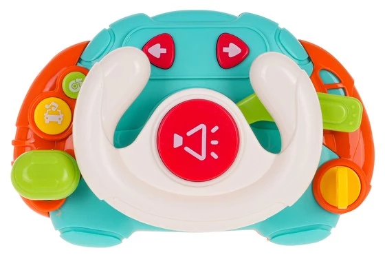Interaktywna kierownica, symulator jazdy z funkcją dźwięku i światła dla dzieci powyżej 18-go miesiąca życia. Zestaw wykonany został z najlepszej jakości plastiku w żywych kolorach przyciągających wzrok maluszka i zachęcających do zabawy. Zabawka jest w pełni bezpieczna, nie posiada ostrych krawędzi. Symulator posiada: - stacyjka na kluczyk, po przekręceniu którego słyszymy odgłos odpalania pojazdu, - obrotowa kierownica, która przy kręceniu wydaje odgłosy, - klakson z odgłosami i migoczącym światełkiem, - manetka kierunkowskazów, która po przesunięciu w dół uruchamia prawy kierunkowskaz z odgłosem i podświetleniem, a w górę lewy kierunkowskaz, - przycisk muzyczny, - przycisk z odgłosami różnych klaksonów, - ruchoma skrzynia biegów z odgłosami. Zabawka zasilana jest bateriami typu 2 x AA 1,5 V (brak w zestawie). Funkcje symulatora: - odpowiedni dla dzieci od 3-go roku życia, - wykonany z najlepszej jakości plastiku w żywych kolorach, - bezpieczny, nie posiada ostrych zakończeń, - funkcje interaktywne * dźwięki: odgłosy odpalania pojazdu po przekręceniu kluczyka, odgłosy kręcenia kierownicą, odgłos klaksonu, odgłosy kierunkowskazów, muzyka, odgłosy skrzyni biegów, * światła: podświetlany klakson, podświetlane kierunkowskazy, |