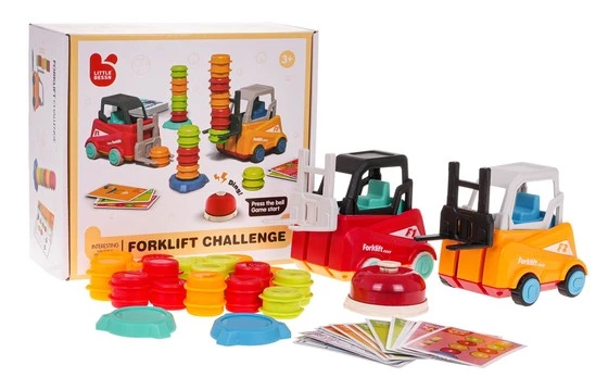 - 2 x wózek widłowy, - 2 x podstawka do układania, - 18 x beczułek do układania (3 różne wysokości, 3 różne kolory), - 18 x karty do układania (12 kart z gotowymi wzorami, podzielone na 5 stopni trudności, 6 kart do samodzielnego wypełnienia), - dzwonek, - instrukcja w języku angielskim. |