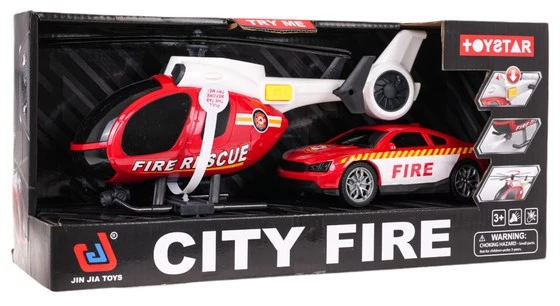 Interaktywny zestaw straży pożarnej, helikopter i autko dla dzieci powyżej 3-go roku życia. Zestaw wykonany został z najlepszej jakości plastiku w żywych kolorach. Helikopter posiada przycisk aktywujący funkcje świetlne i dźwiękowe. Naciśnięcie przycisku uruchamia oświetlenie przednie i tylne helikoptera oraz odgłosy pracy silnika, alarmy i odgłosy lotu. Helikopter zasilany jest bateriami typu 3 x AG13 (w zestawie). Pojazd strażacki posiada gumowe opony oraz wolne koło, ułatwiające przesuwanie go swobodnie po podłożu. Śmigła helikoptera możemy obracać manualnie. Funkcje zestawu: - odpowiedni dla dzieci od 3-go roku życia, - wykonany z najlepszej jakości plastiku w żywych kolorach, - efekty świetlne: oświetlenie przednie i tylne helikoptera, - efekty dźwiękowe: odgłosy pracy silnika, klakson, odgłos lotu, - wolne koło w autku strażackim, - gumowe opony w autku, - obrotowe śmigła (manualnie). |