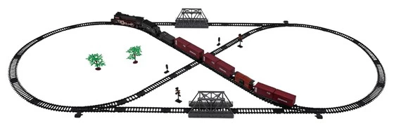 - lokomotywa, - wagon osobowy, - wagon z węglem, - wagon z pilotem, - 3 x wagon z kontenerami, - części składowe toru, - 2 mosty, - 2 znaki, - 2 drzewka, - pipetka na wodę, - kabel do ładowania USB, - instrukcja. |