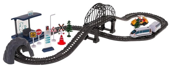 Zestaw kolejka z torami i akcesoriami dla dzieci od 3-go roku życia. Zestaw wykonany został z najlepszej jakości materiałów, tory posiadają mocne zaczepy. Na zestaw składa się 76 elementów: konstrukcja torów z mostem, tunelem i stacją, pociąg , znaki drogowe, jest też autko taxi z pasażerami. Pociąg zasilany jest bateriami typu 1 x AA 1,5 V (brak w zestawie), stacja bateriami typu 3 x AG3 1,5 V (w zestawie).
