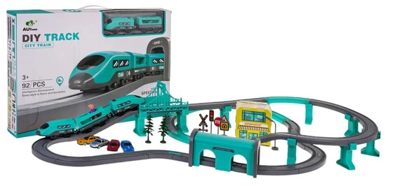Bogato wyposażony zestaw torów z pociągiem i akcesoriami dla dzieci od 3-go roku życia. Zestaw wykonany został z najlepszej jakości plastiku w żywych kolorach przyciągających wzrok dziecka. W zestawie znajduje się 92 elementów: części konstrukcyjne torów, pociąg, stacja, most, supermarket, znaki drogowe oraz autka i figurka. Pociąg zasilany jest bateriami typu 2 x AAA 1,5 V (brak w zestawie). Funkcje zestawu: - odpowiedni dla dzieci od 3-go roku życia, - bogato wyposażony aż 92 elementy, - wykonany z najlepszej jakości materiałów, - żywe kolory przyciągają wzrok dziecka, - pociąg zasilany jest bateriami i porusza się do przodu, - wagoniki pociągu łączone na mocne magnesy, - 4 autka w zestawie. |