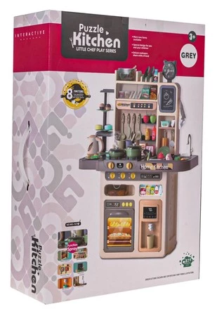 Rewelacyjna, bogato wyposażona, duża multifunkcyjna kuchnia dla dzieci powyżej 3-go roku życia. Kuchnia posiada zlew z kranem, z którego leje się woda, podświetlane palniki z odgłosami gotowania i smażenia, jeden z palników posiada funkcję wytwarzania pary wodnej, ruchome pokrętła, okap z lampką i panelem muzycznym, otwierany piekarnik, lodówkę z podajnikiem wody, zegar, półeczki i liczne akcesoria kuchenne. Zestaw zasilany jest bateriami typu 7 x AA 1,5 V (brak w zestawie).