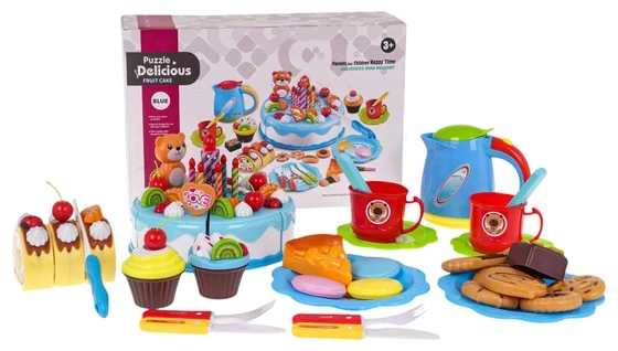 - 6 kawałków tortu ( w całości ok. ok. 8,5 cm x 15 cm), - 7 świeczek w tym jedna większa, świecąca (ok. 7 cm x 2 cm – świeczka duża, 4,5 x 0.5 cm – świeczka mała), - 12 bez (ok. 2 cm x 2 cm), - 5 wisienek (ok. 4,5 cm x 2,5 cm), - miś (ok. 6 cm x 3,5 cm), - 4 kiwi (ok. 2,5 cm x 2,5 cm), - 5 truskawek (ok. 2,5 cm x 1,5 cm), - 5 mandarynek (ok. 2,5 cm x 1,5 cm), - 5 pałeczek lukrowych (ok. 2,5 cm x 1,5 cm), - 2 babeczki (ok. 5 cm x 6 cm), - 11 różnych ciasteczek (różne kształty, wymiary ok. 6 cm x 5 cm), - 3 kawałki rolady (w całości ok. 7,5 cm x 7,5 cm x 6 cm), - 2 nożyki mniejsze (ok. 11 cm x 2 cm), - nożyk duży (14 cm x 2,5 cm), - 2 łyżeczki ok. 10 cm x 2,5 cm, - 2 widelce ok. 10 cm x 2,5 cm, - 2 kubeczki (ok. 5 cm x 7 cm), - roladka ok. 7,5 cm x 6,5 cm, - 4 talerzyki (małe ok. 10 cm średnica, duże ok. 13,5 cm średnica), - czajnik ok. 10 cm x 11 cm x 4 cm, - gwizdek - naklejki dekoracyjne. |