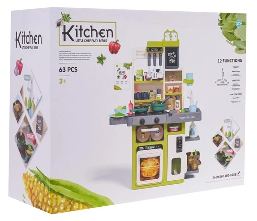 Rewelacyjna, bogato wyposażona, duża multifunkcyjna kuchnia dla dzieci powyżej 3-go roku życia. Kuchnia posiada zlew z kranem, z którego leje się woda, podświetlane palniki z odgłosami gotowania i smażenia, jeden z palników posiada funkcję wytwarzania pary wodnej, ruchome pokrętła, otwierany piekarnik, otwieraną lodówkę, zegar z ruchomymi wskazówkami, półeczki i liczne akcesoria kuchenne (63 elementy). Zestaw zasilany jest bateriami typu 3 x AA 1,5 V (brak w zestawie).