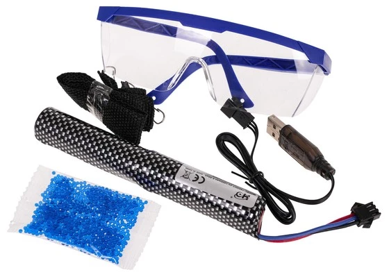 - karabin, - magazynek, - lufa, - tłumik, - celownik, - kolba, - USB kabel, - akumulator 7,4V, - saszetka z kulkami do przygotowania, - smycz, - okulary ochronne, - instrukcja w języku angielskim, - kolorowe opakowanie. |