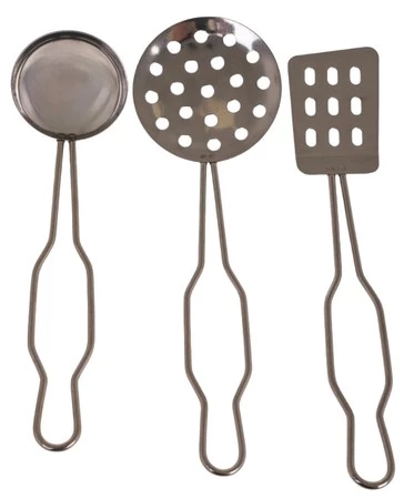 - niebieski garnek z rączkami i pokrywką, - różowy garnek z rączkami i pokrywką, - zielona patelnia, - łopatka, - łyżka cedzakowa, - chochelka, - podstawka kuchenna. |