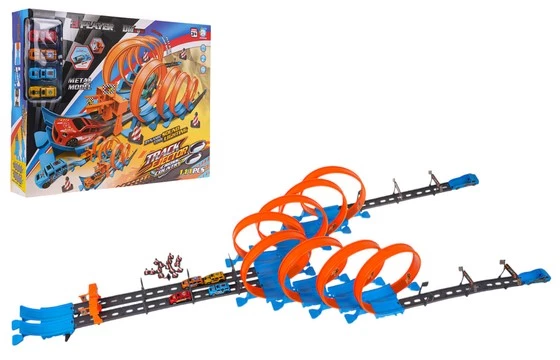 Ekstremalny, interaktywny tor wyścigowy z metalowymi autkami w zestawie dla dzieci powyżej 3-go roku życia. Zestaw składa się z 111 elementów do samodzielnego montażu. Po zbudowaniu tor posiada mnóstwo pętli 360 stopni. W zestawie znajdują się cztery pojazdy z metalową karoserią. Tor wyposażono w efekty dźwiękowe i świetlne takie jak wesołe melodie, odgłosy jazdy, klakson oraz mrugające światełka. Zabawka zasilana jest bateriami typu 3 x LR41 – maszt (baterie w zestawie) oraz 9 x LR44 – plastikowe autka (baterie w zestawie).