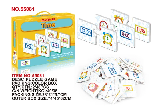 Gra edukacyjna z nauką zegara dla dzieci od trzeciego roku życia. Gra składa się z 60 puzzli, dzięki którym dziecko poznaje czas i uczy się dopasowywać kształty. Gra trenuje również koordynację ręka-oko, rozwija spostrzegawczość i koncentrację. Z jednej strony mamy rysunek zegara, a z drugiej czas zapisany w formie cyfrowej. Dziecko musi dopasować jeden element do drugiego. Gra idealnie łączy w sobie naukę i zabawę.