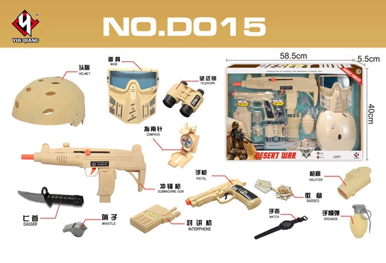 Bogato wyposażony zestaw żołnierza w piaskowym kolorze dla dzieci od trzeciego roku życia. Zestaw składa się z 14 elementów, dzięki którym Twoja pociecha poczuje się jak prawdziwy żołnierz. Zestaw wykonano z dbałością o szczegóły. Będzie idealny do zabawy na świeżym powietrzu i odgrywania ról. Karabin działa manualnie, po przesunięciu pomarańczowego kółeczka w prawą stronę i naciśnięciu spustu wydaje odgłos strzelania. Pistolet zasilany jest bateriami typu 3 x AG13 (w zestawie).