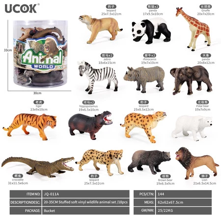 - gepard 1 ok. 25 cm x 9 cm x 12 cm, - gepard 2 ok. 26 cm x 12 cm x 8 cm, - panda ok. 17 cm x 9,5 cm x 10 cm, - żyrafa ok. 20 cm x 10 cm x 20 cm, - zebra ok. 18 cm x 16 cm x 7 cm, - nosorożec ok. 19 cm x 7 cm x 10 cm, - słoń ok. 20 cm x 8 cm x 12 cm, - tygrys ok. 23 cm x 9 cm x 10 cm, - hipopotam ok. 19 cm x 6,5 cm x 12 cm, - miś polarny ok. 19 cm x 7 cm x 11 cm, - krokodyl ok. 31 cm x 11,5 cm x 6 cm, - miś brunatny ok. 19 cm x 6,5 cm x 10 cm, - lew ok. 21 cm x 6,5 cm x 14,5 cm, - puma ok. 26 cm x 12 cm x 10,5 cm, - opakowanie ok. 34 cm x 30 cm. |