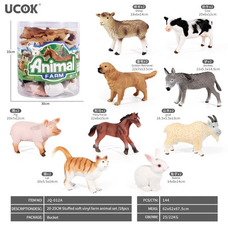- owca ok. 18 cm x 6 cm x 14 cm, - krowa ok. 21 cm x 6 cm x 12 cm, - pies ok. 22 cm x 7 cm x 13,5 cm, - osiołek ok. 21 cm x 5 cm x 14,5 cm, - świnka ok. 20 cm x 7 cm x 12 cm, - konik ok. 22 cm x 6 cm x 15 cm, - koza ok. 18,5 cm x 5,5 cm x 13 cm, - kotek ok. 20 cm x 5 cm x 14 cm, - królik ok. 14 cm x 8 cm x 14 cm, - opakowanie ok. 30 cm x 34 cm. |