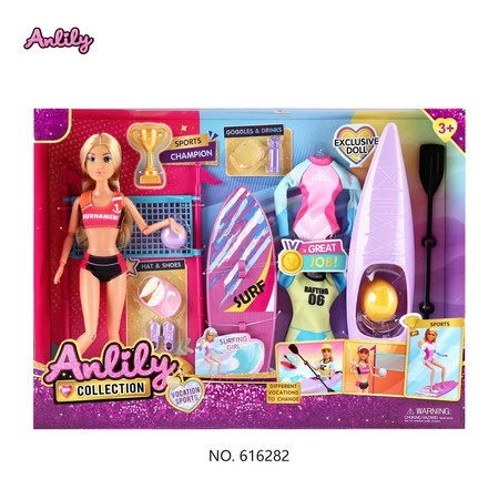 - lalka ubrana w strój do siatkówki, - siatka do siatkówki, - piłka, - czapka z daszkiem, - buty sportowe - medal zwycięstwa, - okulary, - butelka na wodę, - deska do surfowania, - kajak, - kask, - wiosła, - ubranie do surfowania, - ubranie na kajak. |