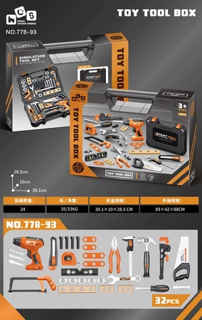 - skrzynka na narzędzia ok. 38 cm x 27,5 cm x 10 cm - wiertarko-wkrętarka ok. 13 cm x 13 cm x 5 cm, - nóż ok. 14,5 cm x 4 cm x 1,5 cm, - śrubokręt ok. 15 cm x 3 cm, - piłka ręczna ok. 20,5 cm x 7,5 cm x 1,5 cm, - metr ok. 6,5 cm x 5,5 cm x 4 cm, - atrapy drewienek do wkręcania ok. 6,5 cm x 3 cm x 1 cm, - duże drewienko do wkręcania ok. 16 cm x 3 cm x 1 cm, - młotek ok. 17 cm x 8 cm x 2,5 cm, - kombinerki ok. 15 cm x 5 cm x 1,5 cm, - elementy plastikowe z otworami do wkręcania od ok. 6 cm do 9 cm, - piła do metalu ok. 20 cm x 8 cm x 2 cm, - nakładka ok. 3 cm średnicy, - klucz oczkowo-płaski ok. 14 cm x 4 cm x 1,5 cm, - suwmiarka ok. 17 cm x 6 cm x 1 cm, - śruby ok. 5,5 cm x 1,5 cm, - wymienne bity ok. 6 cm x 1,5 cm, - bit do wiertarko-wkrętarki ok. 7,5 cm x 1,5 cm, - poziomica ok. 16,5 cm x 36,5 cm x 1,5 cm, - klucz nastawny ok. 17,5 cm x 5 cm x 1,5 cm, - opakowanie ok. 38 cm x 28,5 cm x 10,5 cm. |