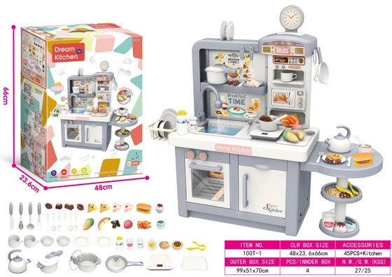 Interaktywna, bogato wyposażona kuchnia z efektami dźwięku, światła i pary dla dzieci od trzeciego roku życia. Wszystkie elementy zestawu wykonano z najlepszej jakości bezpiecznych dla dzieci materiałów. Kuchnia utrzymana jest w szaro – białej tonacji, będzie pasowała do każdego dziecinnego pokoju. Zabawkowa kuchnia posiada kuchenkę mikrofalową, zlew z kranikiem, kuchnię indukcyjną, piekarnik, ekspres do kawy, lodówkę, stojak na desery i mnóstwo akcesoriów kuchennych, takich jak garnki, sztućce, talerze, czajnik, kubeczki oraz atrap produktów spożywczych. Z kranika naprawdę leje się woda, kuchenka indukcyjna jest podświetlana, ma wyświetlacz temperatury oraz wydaje realistyczne dźwięki gotowania i smażenia. Dodatkową atrakcją kuchni jest wydobywająca się bezpieczna (chłodna) para z jednego z garnków. Kranik zasilany jest bateriami typu 2 x 1,5V AA (brak w zestawie), płyta indukcyjna bateriami 3 x 1,5V AAA (baterii brak w zestawie).