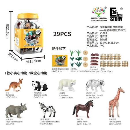 - figurki: kangur, panda, miś polarny, tygrys, nosorożec, zebra, koń, żyrafa,
