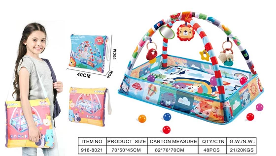 Edukacyjna mata do leżenia, suchy basen dla dzieci od pierwszych dni życia. Mata wykonana została z bezpiecznych dla maluszka materiałów w żywych kolorach przyciągających wzrok dziecka. Materiał, z którego wykonano matę, jest łatwy w utrzymaniu czystości, konstrukcja jest solidna i stabilna. Na pałąku znajdują się odczepiane zawieszki, które można przyczepić również do łóżeczka czy fotelika. W zestawie znaleźć możemy także kilka piłeczek. Cały zestaw zapakowany jest w opakowanie w kształcie torebki z paskiem.