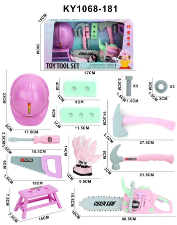 - kask ok. 17,5 cm x 8 cm x 23 cm, - śrubokręt ok. 15,5 cm x 2,5 cm, - piła ręczna ok. 19 cm x 1,5 cm x 2,5 cm, - stolik warsztatowy ok. 16 cm x 7,5 cm x 7,5 cm, - 2 elementy z otworami do wkręcania śrubek ok. 11,5 cm x 1 cm x 4 cm oraz ok. 9 cm x 1 cm x 4 cm, - rękawice ochronne ok. 9,5 cm x 1 cm x 14 cm, - śrubka ok. 1,5 cm x 1,5 cm x 5,5 cm, - nakładka ok. 3 cm x 1,5 cm x 3 cm, - siekiera ok. 27,5 cm x 2,5 cm x 14,5 cm, - młotek ok. 21,5 cm x 3 cm x 8 cm, - piła mechaniczna ok. 40,5 cm x 10 cm x 15,5 cm, - opakowanie ok. 57 cm x 30 cm x 15 cm. |