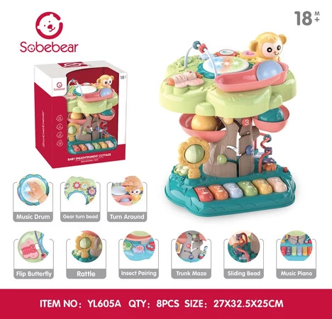 Interaktywne, wielofunkcyjne drzewko z funkcją dźwięku i światła oraz elementami manipulacyjnymi dla dzieci od osiemnastego miesiąca życia. Zestaw wykonano z najlepszej jakości tworzywa sztucznego i nie posiada ostrych zakończeń. Żywe kolory, elementy dźwiękowe i świetlne stymulują zmysły dziecka na wielu płaszczyznach. Na górze drzewka znajduje się muzyczny bębenek z podświetleniem, przekładanka z koralikami, małpka, pszczółka oraz zjeżdżalnia dla piłeczek. Wrzucona piłeczka toczy się zjeżdżalnią na sam dół. Na pniu drzewa i obok niego znajdują się przekładanki. Samym spodem mamy kolorowe pianinko muzyczne, przycisk ze zmianą trybów pianinka, przycisk z bębnem, grzechotkę i zwierzątka na sznureczku do dopasowania. Zabawka zasilana jest bateriami typu 3 x AA 1,5V (brak w zestawie).