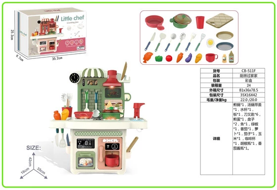 - kuchnia, - patelnia, - garnek z pokrywką, - kubeczek, - kubek z uszkiem, - deska do krojenia, - 2 x talerz, - nóż, - 2 x łopatka, - chochelka, - łyżka do makaronu, - duży widelec, - ketchup, - pieprz, - atrapy produktów spożywczych: ryba, papryka żółta, pomidor, marchewka, bakłażan, kukurydza, jajko sadzone. |