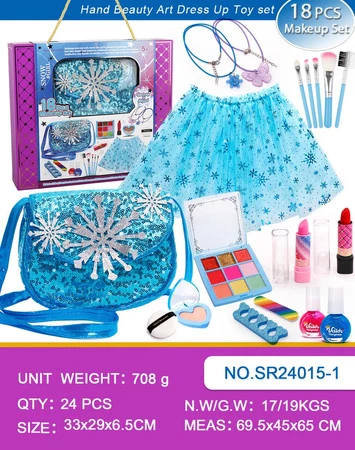 Bogato wyposażony, kolorowy zestaw małej księżniczki, spódniczka, torebka i kosmetyki do makijażu dla dzieci od piątego roku życia. Zestaw składa się z 18 elementów wykonanych z dbałością o szczegóły, z najlepszej jakości materiałów. Kosmetyki są bezpieczne dla dziecka, antyalergiczne, bardzo łatwo się je zmywa. W zestawie możemy znaleźć paletkę z cieniami, lakiery, szminki, pędzelki do makijażu, jest też śliczna torebka, naszyjniki i tiulowa spódniczka.