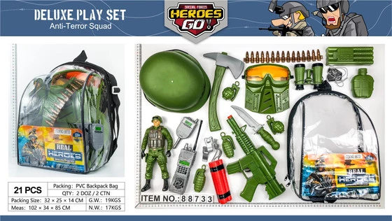 - przezroczysty plecak, - hełm, - okulary z maską, - nóż, - krótkofalówka, - gwizdek, - manierka na wodę, - telefon, - siekierka, - lornetka, - karabin z odgłosem wystrzału, - pas z pociskami, - 4 granaty - figurka żołnierza z ruchomymi rękami i nogami, - materiał wybuchowy, - nieśmiertelnik. |